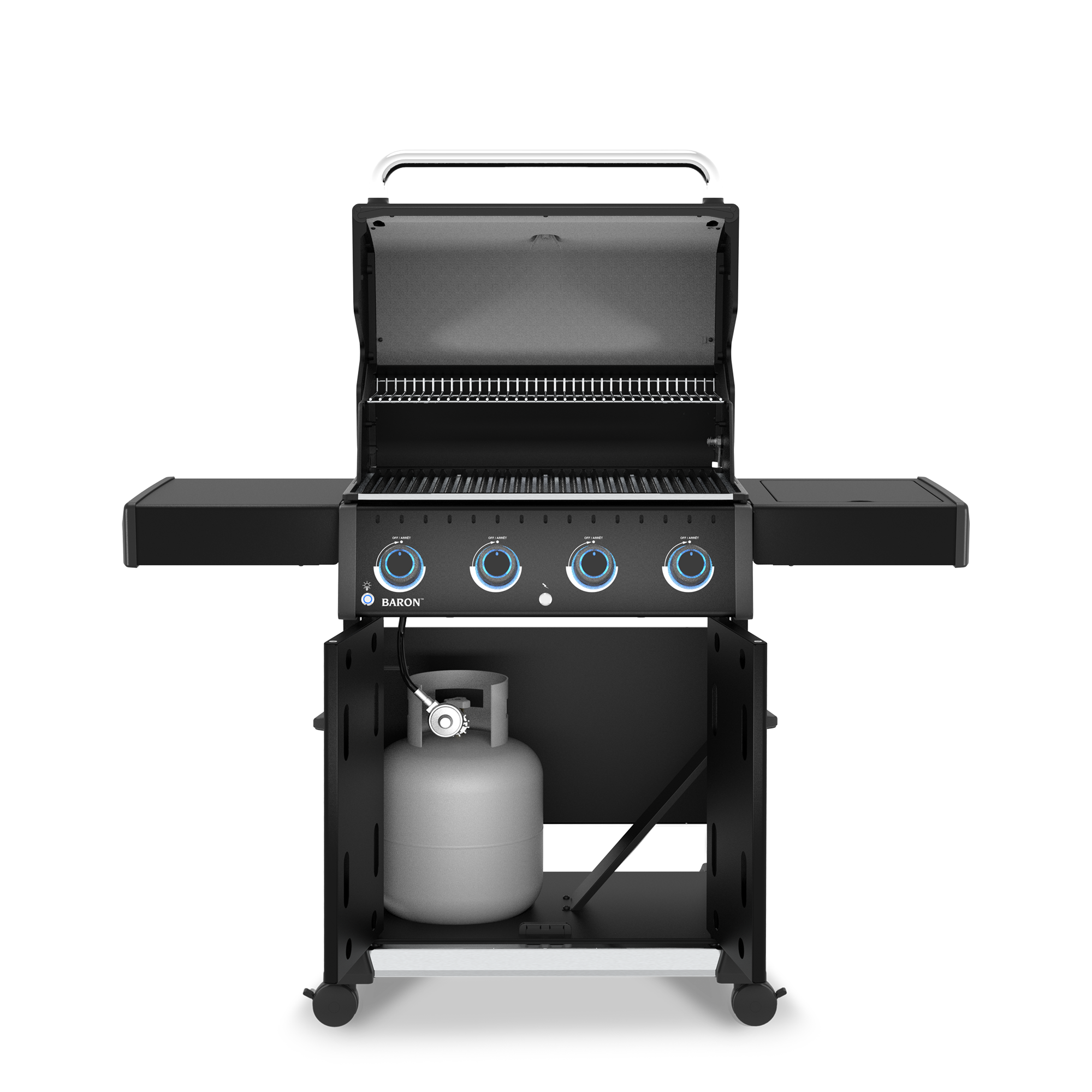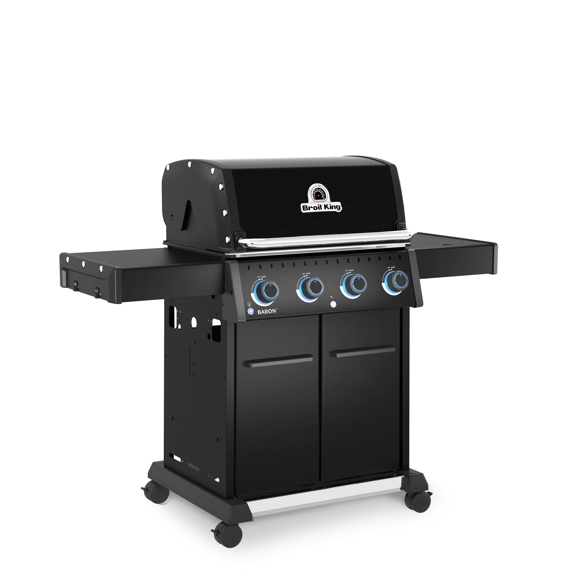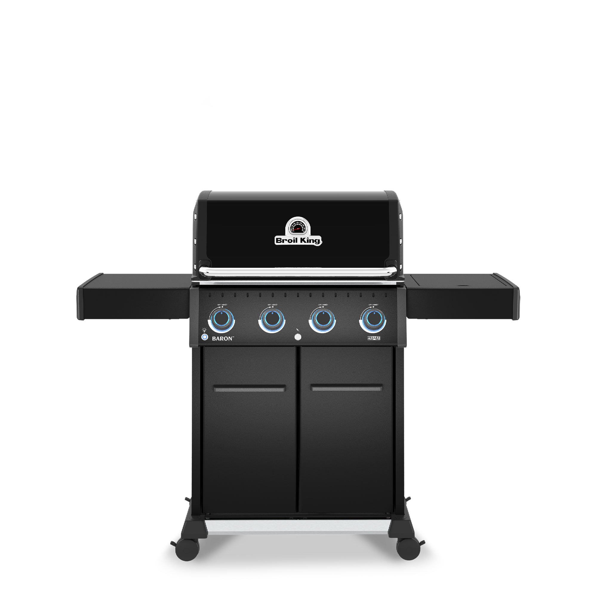 The Baron 420 Pro Shadow is a powerful and versatile grill designed to elevate your backyard cooking. With 630 Sq. in. of total cooking surface and 4 Dual-Tube burners producing 40,000 BTUs, it delivers exceptional performance for everything from quick weeknight dinners to weekend feasts. Durable 8mm stainless steel rod cooking grids provide outstanding heat retention and searing power, supported by a stainless steel warming rack and Broil King’s legendary stainless steel Flav-R-Wave system, which vaporizes juices and infuses them back into your food for unmistakable barbecue flavour. Illuminated control knobs and reliable electronic ignition add convenience, while drop-down side shelves maximize workspace in tight areas. Finished in a sleek matte black design, the Baron 420 Pro Shadow combines style and durability in a package made for long-term performance and is backed by a 15-year top-to-bottom warranty.