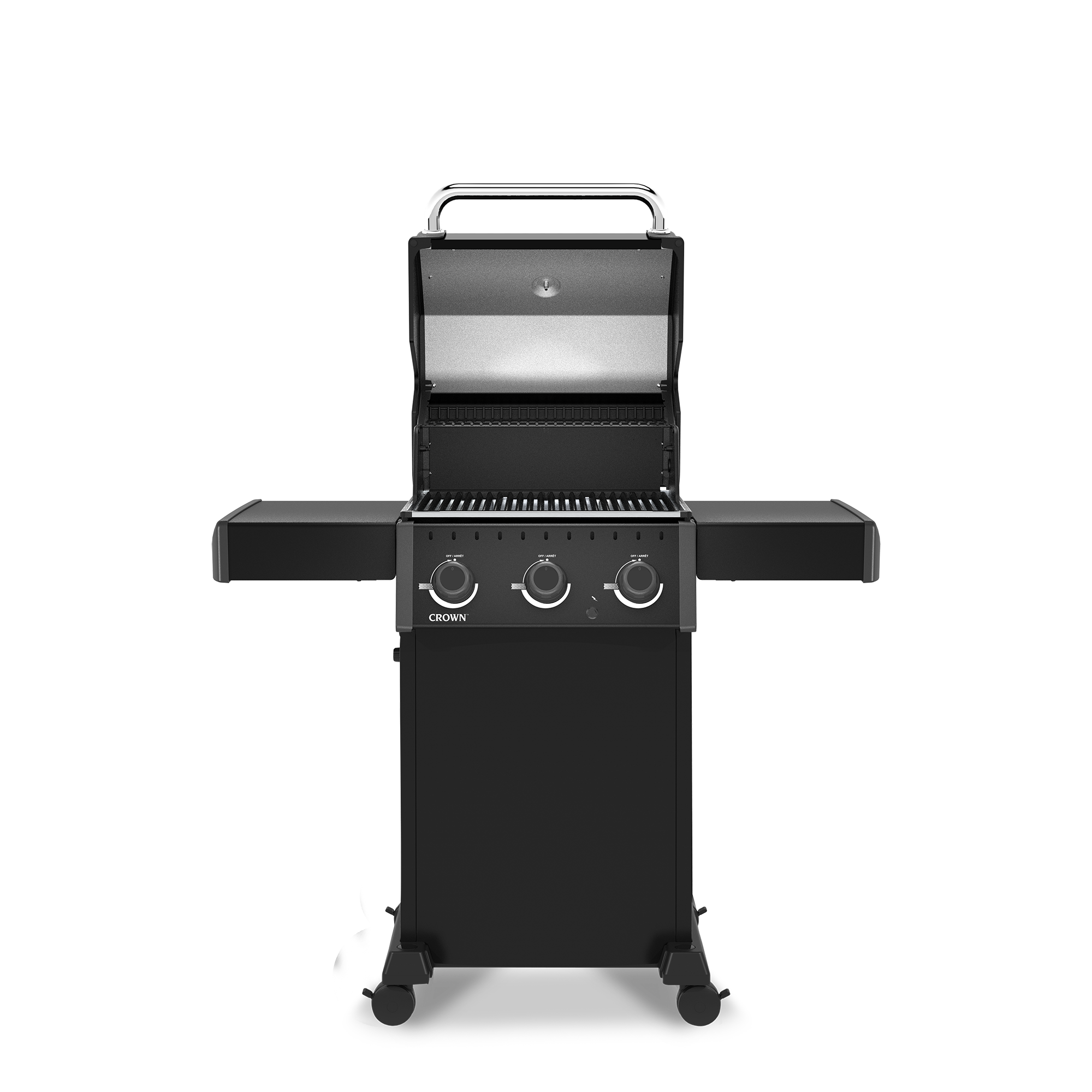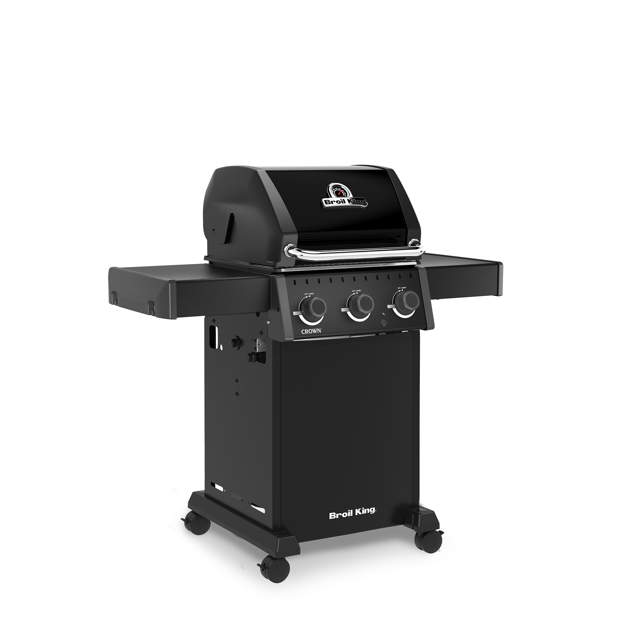 The Broil King Crown 300 Series features a durable cast aluminum oven, 3 stainless steel Dual-Tube burners, stainless steel Flav-R-Wave cooking system, and electronic ignition. All Crown 300 series include heavy-duty 3-position cast iron cooking grids, black drop-down side shelves, and an enclosed black cabinet base.