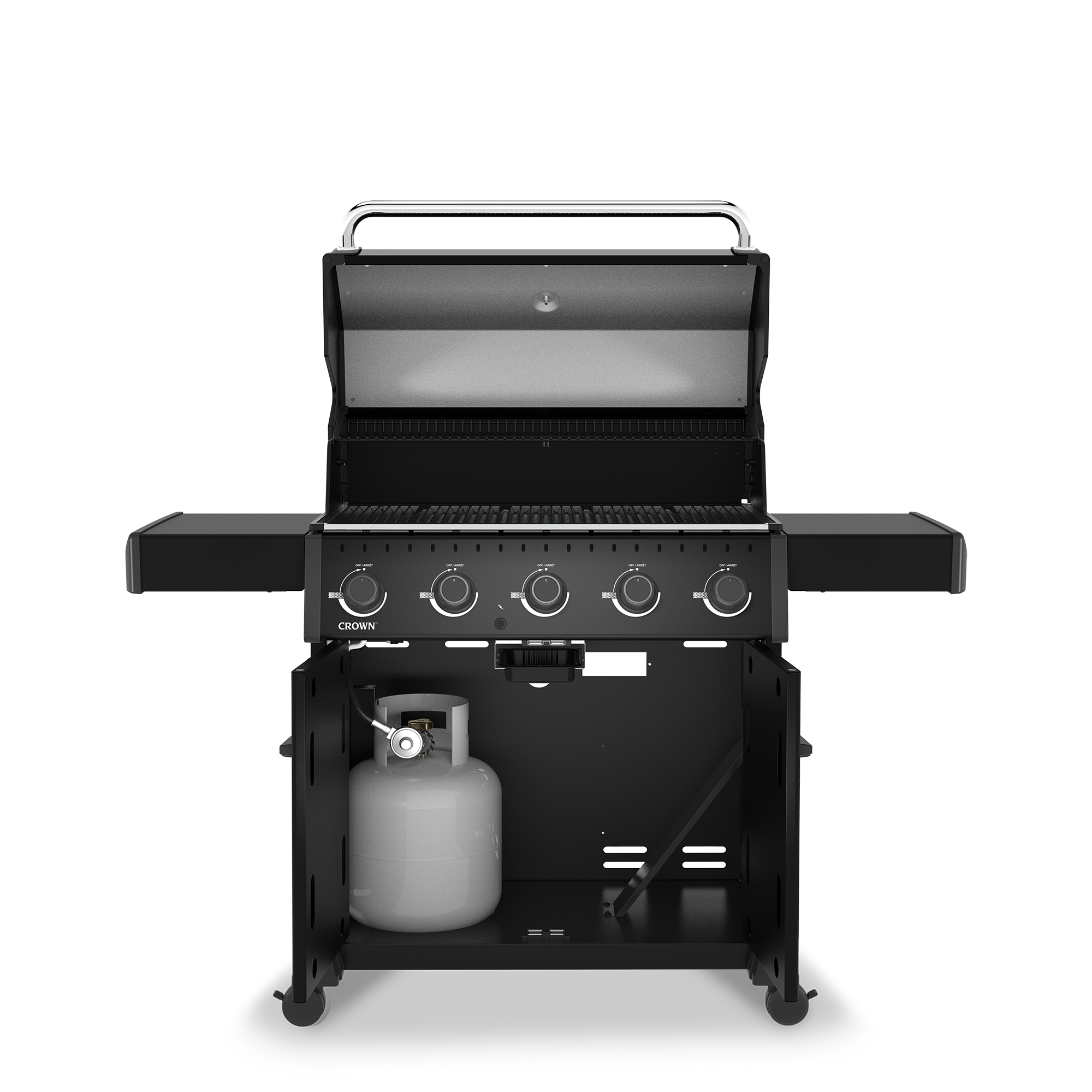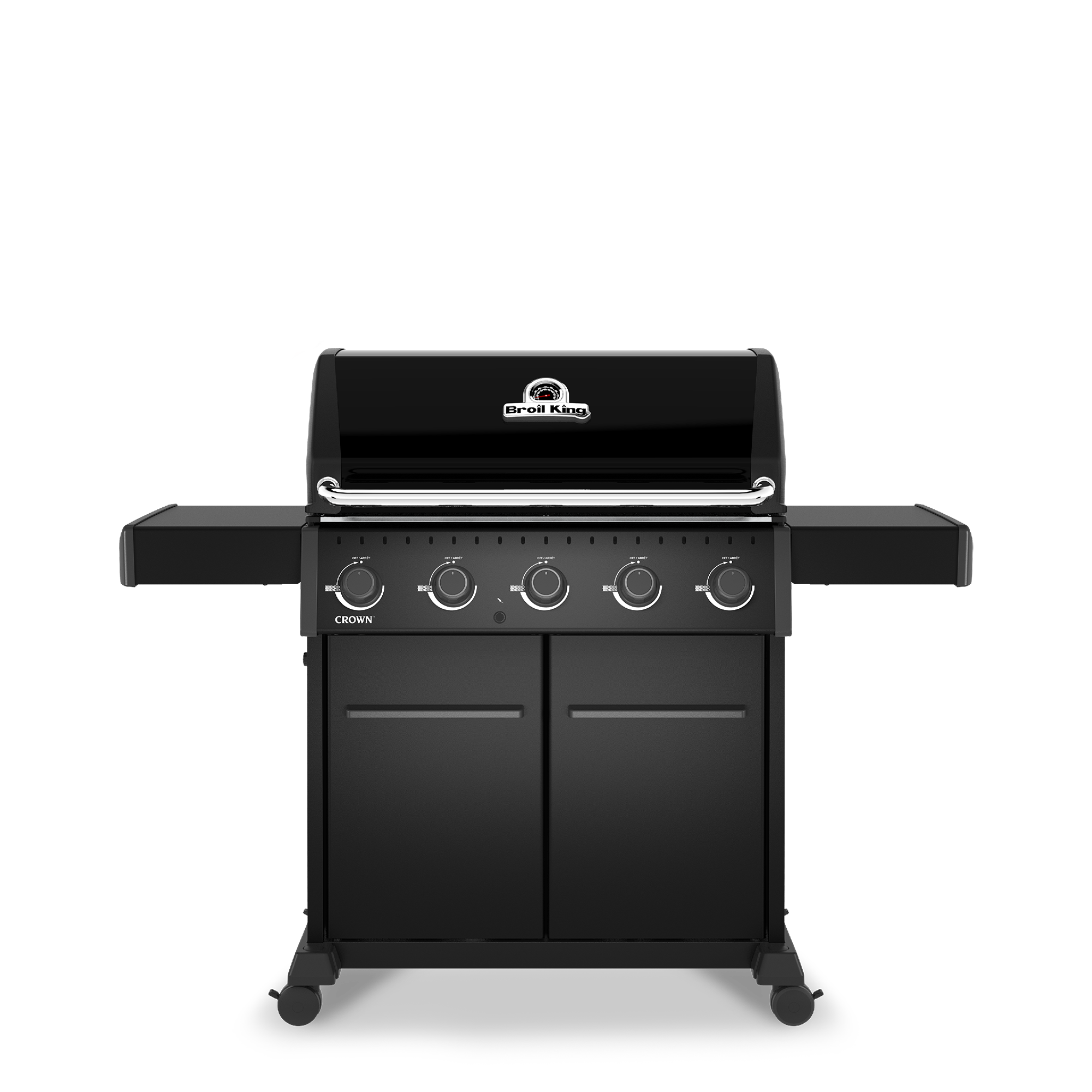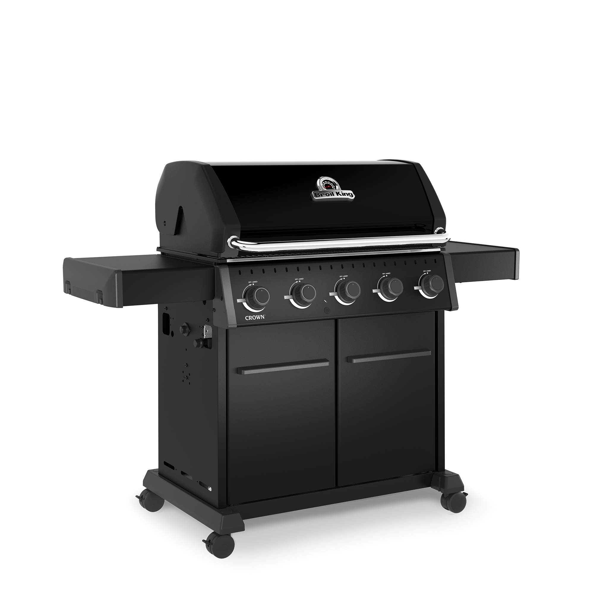 The Broil King Crown 520 Shadow features a durable Therma-Cast aluminum cookbox, 5 stainless steel Dual-Tube burners, stainless steel Flav-R-Wave cooking system, and electronic ignition. All Crown 500 Series models include heavy-duty 3-position cast iron cooking grids, black drop-down side shelves with tool hooks, and an enclosed black cabinet base with rust-resistant zinc-coated steel components