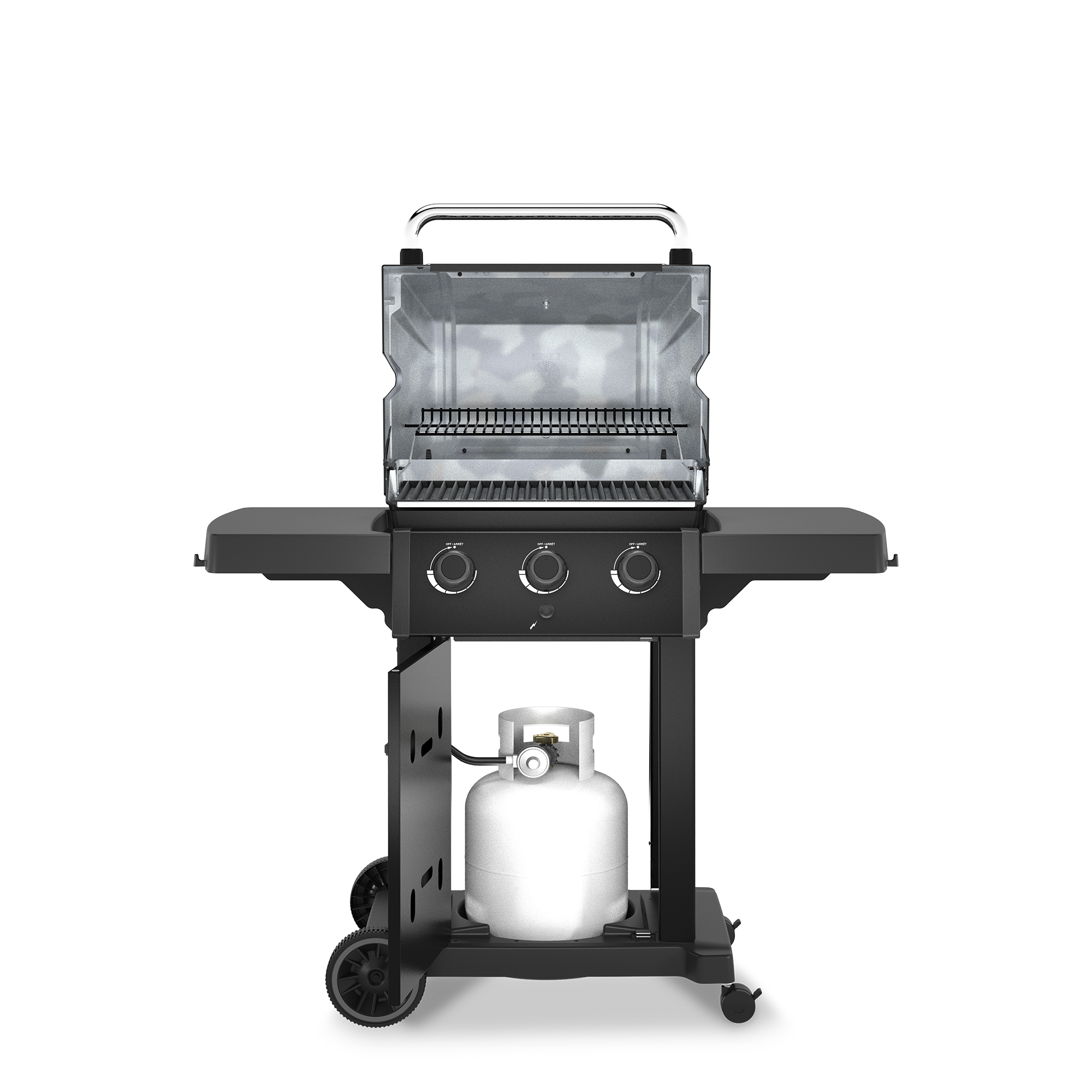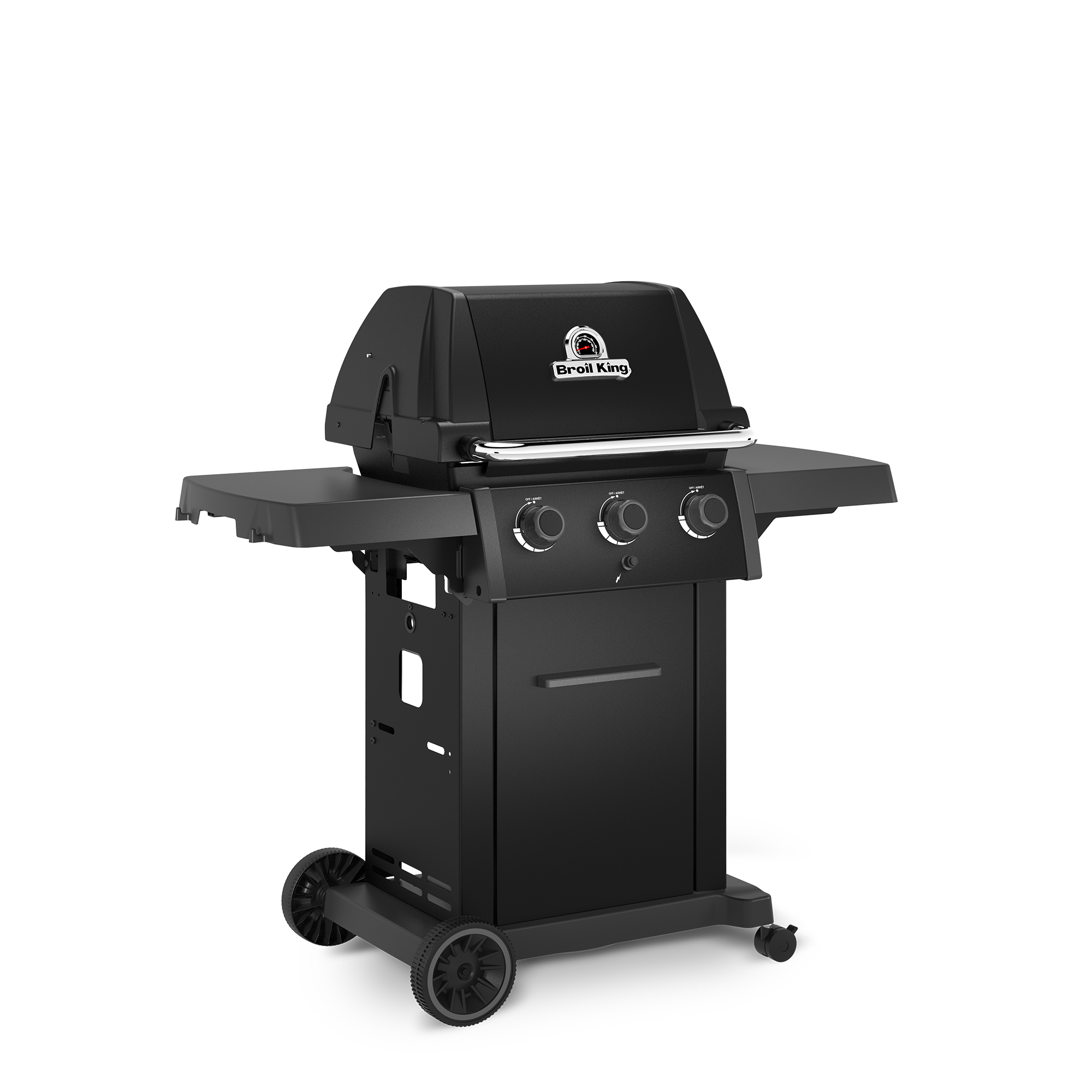 The Royal 320 features 350 sq. in. primary cooking surface and includes 3 stainless steel Dual-Tube burners, reversible heavy-duty cast iron cooking grids, stainless steel Flav-R-Wave cooking system, and electronic ignition. The Royal 320 features painted steel drop-down side shelves and enclosed cabinet base.