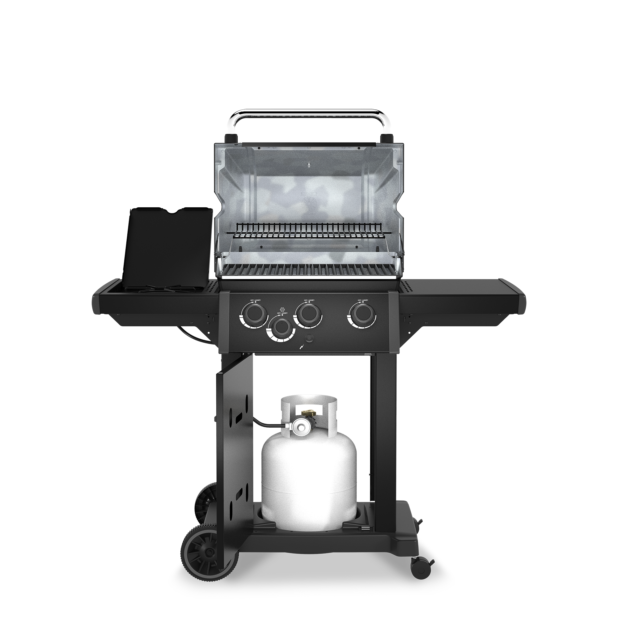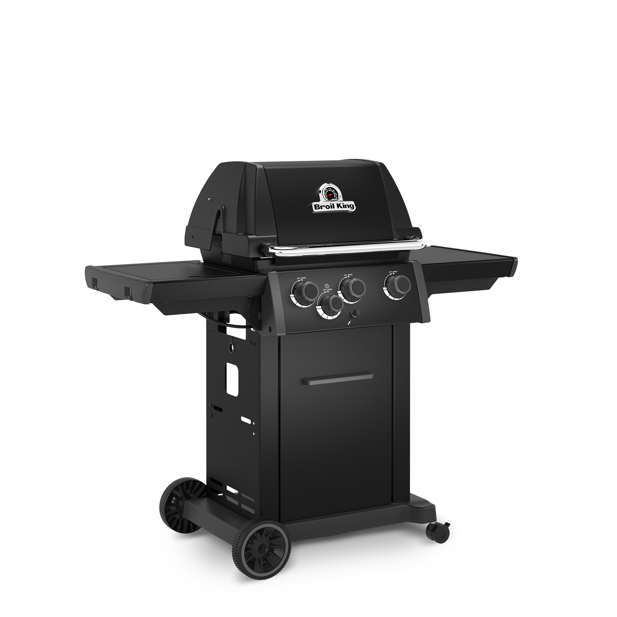 The Royal 340 features 335 sq. in. primary cooking surface and includes 3 stainless steel Dual-Tube burners, reversible heavy-duty cast iron cooking grids, stainless steel Flav-R-Wave cooking system, and electronic ignition.
