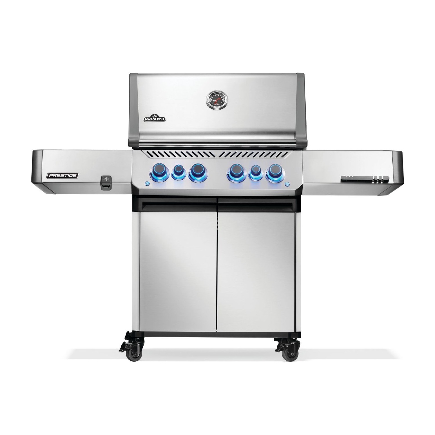 The stainless steel Prestige 500, Propane Gas Grill with Infrared Side and Rear Burner is a dynamic evolution in grilling that connects you with your grilling experience more than ever before. A larger rotisserie burner and infrared sear station, side burner provide enhanced performance. LED Control Knobs illuminate for nighttime entertaining and feature SafetyGlow, glowing red for added safety when the gas is on. The stow-away warming rack keeps things tidy, and hidden tool hooks provide extra prep space. Enjoy the sleek and modern design and the unique cooking methods you already love with the compelling Prestige 500 Gas Grill.