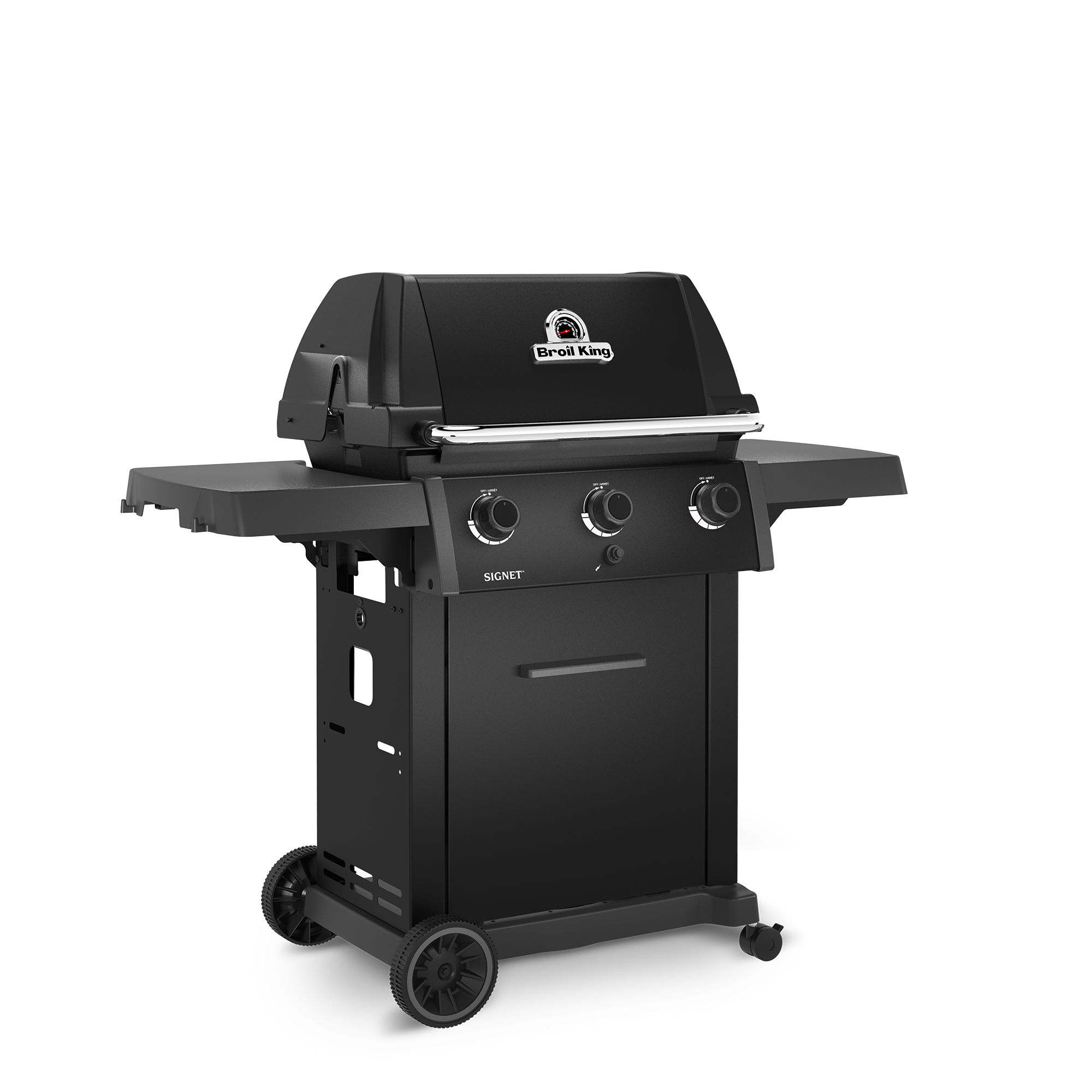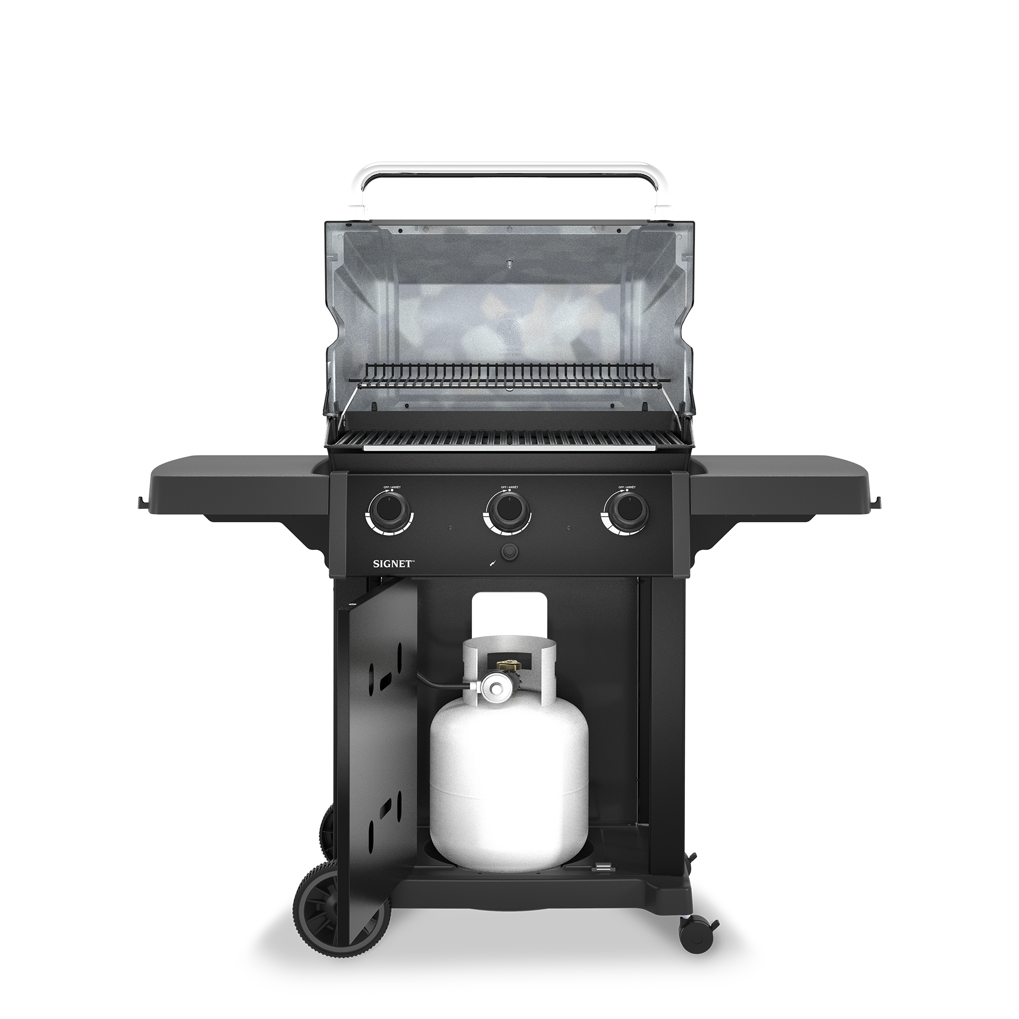 The Signet 320 Shadow features 635 sq. in. total cooking space including porcelain coated warming rack, heavy-duty cast iron cooking grids, stainless steel Flav-R-Wave cooking system, 3 stainless steel Dual-Tube burners, stainless steel drop-down side shelves and enclosed cabinet base.